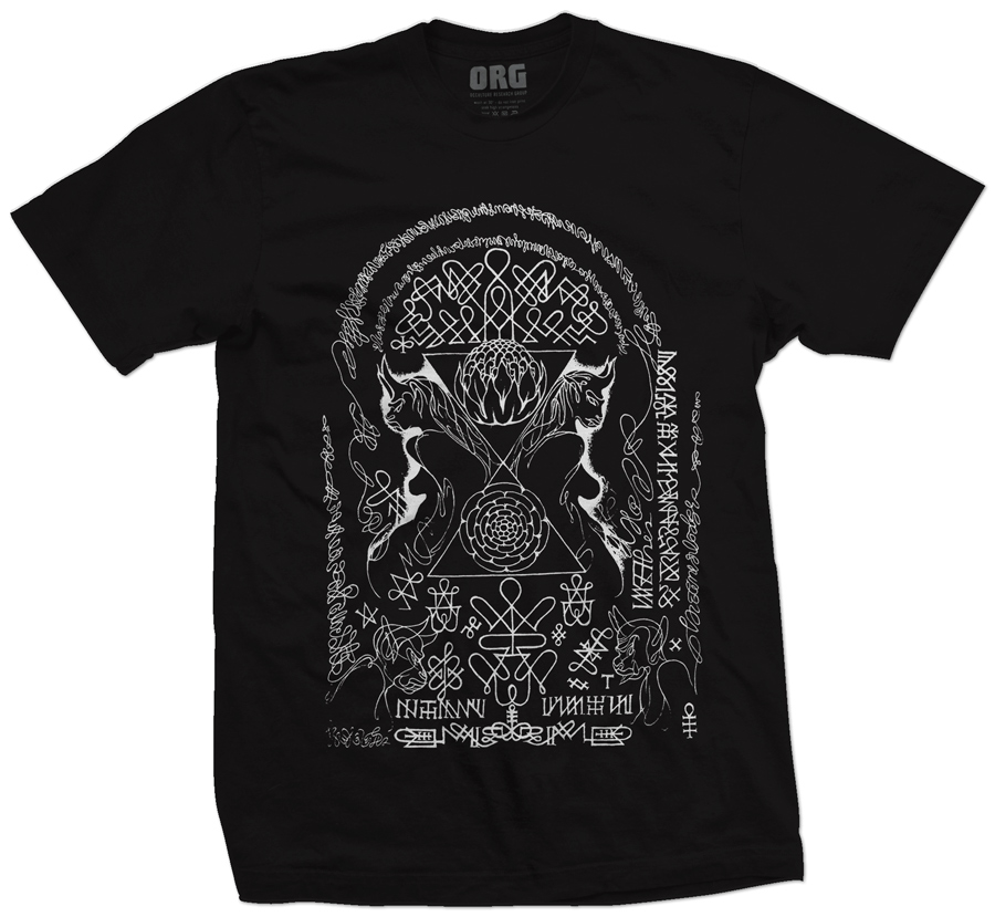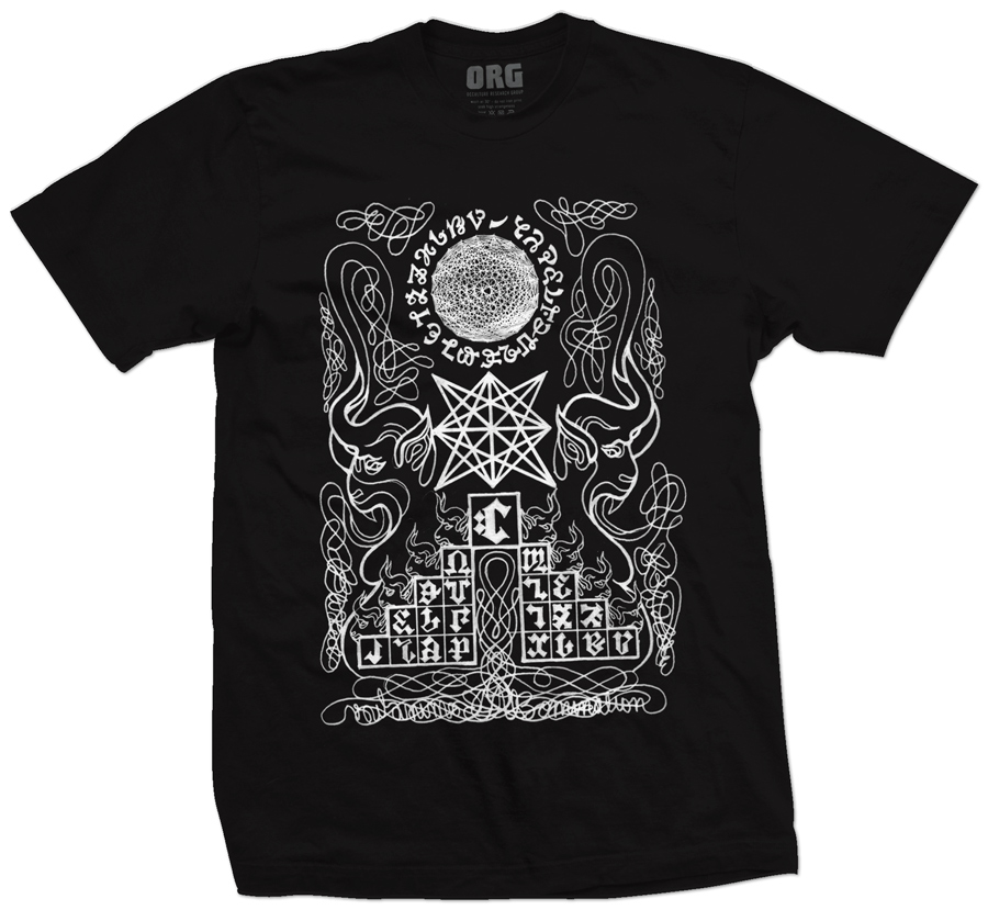 We’ve worked with Barry before when he was in the UK for a performance with his NOKO210 project at the Equinox Festival back in 2009. We’re extremely happy to be working with him again, starting our collaboration with these two shirts. Both designs feature key elements of Barry’s ongoing work with Enochian and automatic drawing, exploring art as both magical and ritual practice.